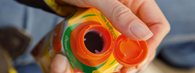 Nie ma potrzeby odrywania zakrętki. Puste opakowanie wraz z zakrętką należy wyrzucić do pojemnika na odpady metalowe i tworzywa sztuczne (żółty pojemnik). To rozwiązanie zapewnia, że zostaną one wspólnie przetworzone i zyskają drugie życie.