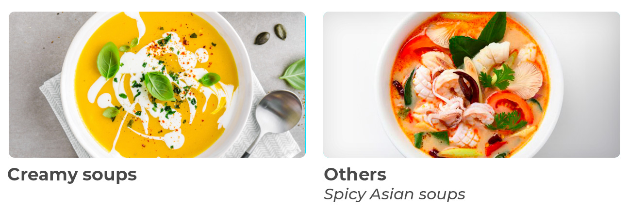Soups are classified into three groups: clear soups, thick soups and chunky soups. Clear soups are usually bouillon and consommé. Thick soups are classified depending upon the type of thickening agent used. Chunky soups are soups containing chopped or whole ingredients, such as meat, vegetables or pasta. No matter what soup you are looking to produce, Tetra Pak® can help.