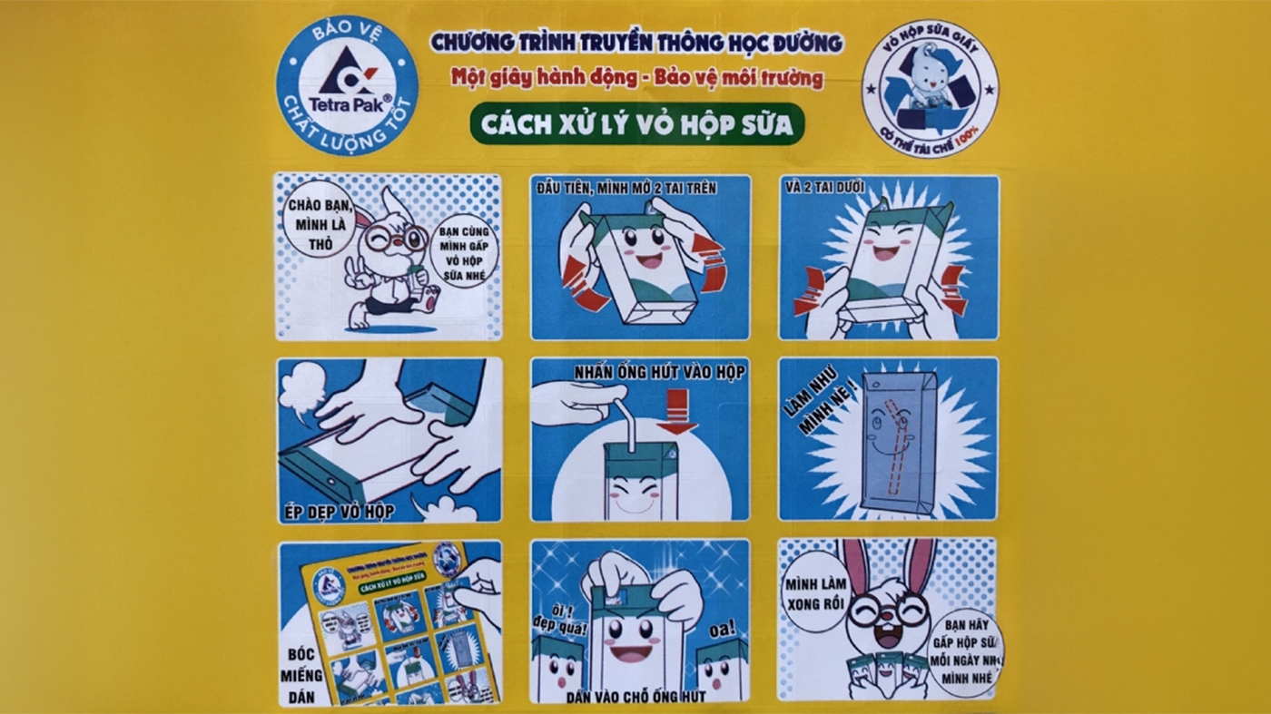 Cụ thể, các em học sinh được hướng dẫn cách xử lý vỏ hộp sữa sau khi uống như cho ống hút vào trong hộp, làm dẹp, dán sticker lên miệng hộp và bỏ vào đúng nơi quy định. Vỏ hộp sữa sau đó sẽ được doanh nghiệp xã hội NHC – là một trong những đối tác của Tetra Pak – thực hiện thu gom định kỳ hai tuần một lần và chuyển về nhà máy Giấy Đồng Tiến Bình Dương – là đối tác tái chế vỏ hộp giấy của Tetra Pak - để tái chế thành các sản phẩm hữu ích khác như giấy công nghiệp và tấm lợp, tấm phẳng sinh thái...