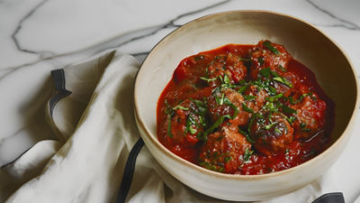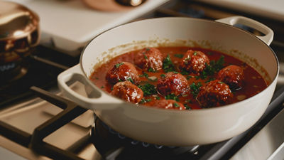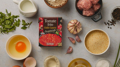 Coloca albóndigas en la sartén y vierte el Tomate Frito Estilo Casero Hacendado. Cocina a fuego bajo durante 10 minutos.