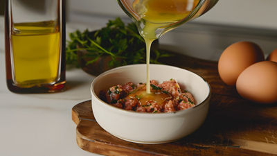 Mezcla los ingredientes: sal y pimienta al gusto, 1 huevo, perejil picado, pan rallado, 1 diente de ajo picado y un chorrito de leche. Amasa todo para integrar bien los ingredientes.