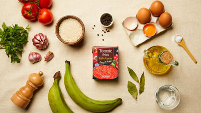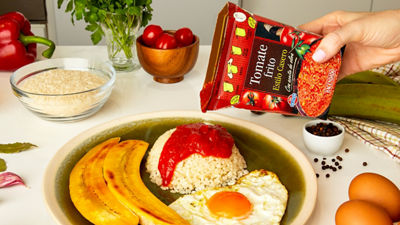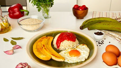 Tomate Frito Estilo Casero, huevo frito, plátano, arroz blanco, aceite de oliva, sal, pimienta y cebolla.