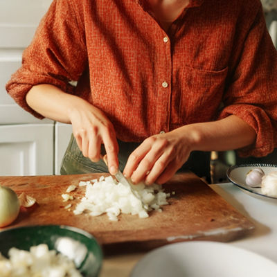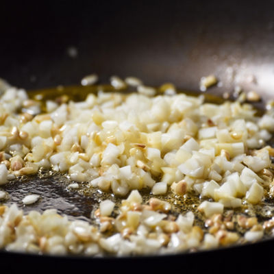 Sofreír el ajo y la cebolla en una sartén con aceite de oliva.