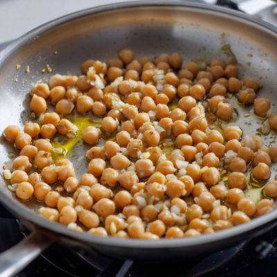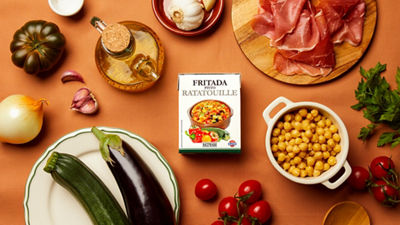 Garbanzos cocidos, Pisto Hacendado, jamón curado, ajo, cebolla y aceite de oliva virgen extra.