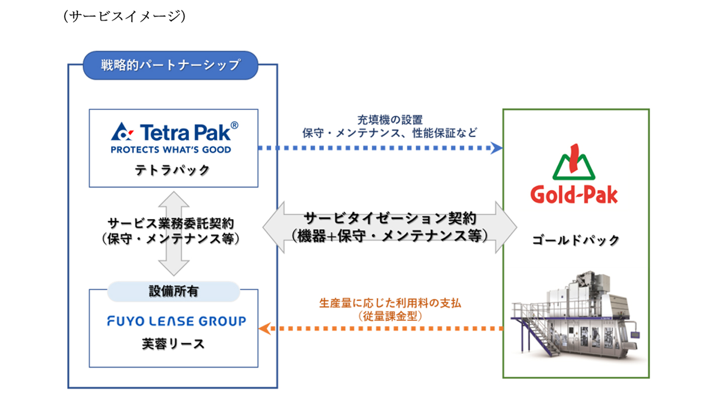 日本テトラパック株式会社(東京都港区、代表取締役社長 ニルス・ホウゴー、以下「テトラパック」)と芙蓉総合リース株式会社(東京都千代田区、代表取締役社長 織田寛明、以下「芙蓉リース」)は、飲料充填機に関する包括的なサービス提供を目的とした戦略的パートナーシップ契約(以下「本提携」)を締結しました。本提携にもとづく第一号案件として、ゴールドパック株式会社(東京都品川区、代表取締役 宇治 俊雄、以下「ゴールドパック」)と、飲料充填機における「Capacity as a Service モデル(以下「CaaS モデル」)」を提供するサービタイゼーション*1 契約(以下「本契約」)締結し、飲料業界へ新たなサービスを提供いたします。