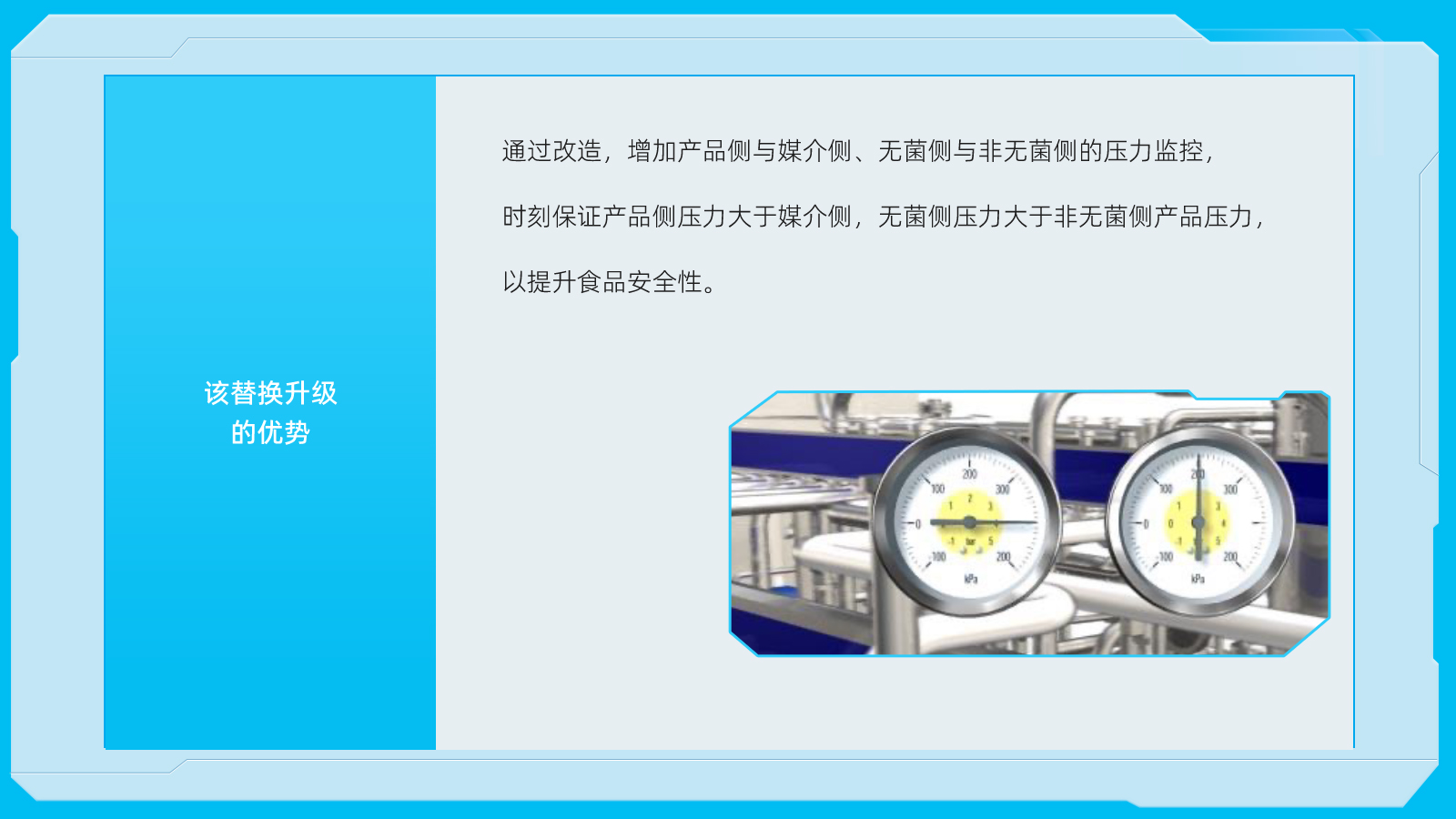 杀菌机产品侧的设备进料生产、待装罐切换、均质机加压与产品流量波动,以及介质侧冰水或塔水的通过,均会在生产中受到压力的影响。为确保无菌产品侧压力高于换热介质,避免泄露导致产品污染,利乐引入杀菌机的压差检测设备,可在程序中设置保护动作和报警系统,以保证食品安全。