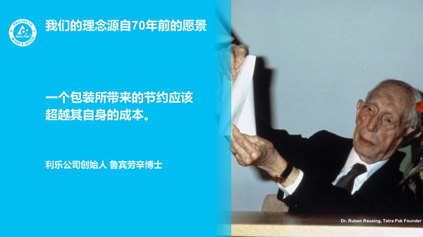 70年前,鲁宾劳辛博士创办利乐公司,他说:“一个包装所带来的节约应该超越其自身的成本”。这句话影响深远,至今指引公司不仅为客户节约经济成本,更在人类面临环境挑战时,节约资源成本。