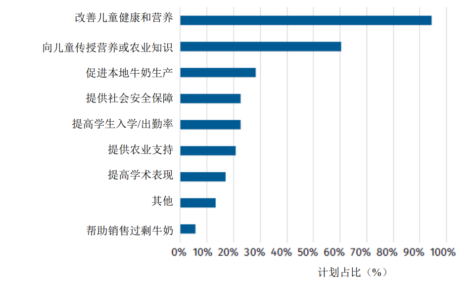 报告分析表明,学生奶及奶制品项目涵盖了多种目标,凸显了多方面多场景的重要性。受访者可选择三大目标,结果排名榜首的是改善儿童健康和营养(2023 年为 94%;2019 年为 83%)。在本次调查中,第二大目标是教育儿童有关营养或农业的知识(60%),第三大为促进当地牛奶生(28%)。
